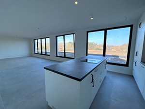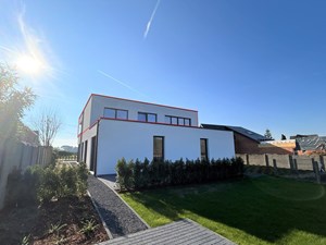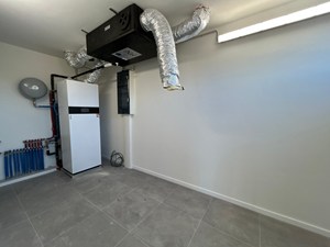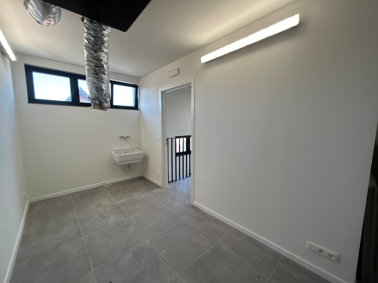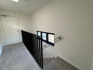 Verdieping 1: De overloop biedt toegang tot berging 1 (met alle technieken: ventilatiesysteem D, warmtepomp, uitgietbak), toilet 1 en tot de leefruimte met open keuken dewelke voorzien is van alle toestellen (combi-oven, vaatwasser, inductiekookplaat met geïntegreerde dampkap, koelkast, spoelbak) met aansluitend berging 2 (aansluiting wasmachine / droogkast).