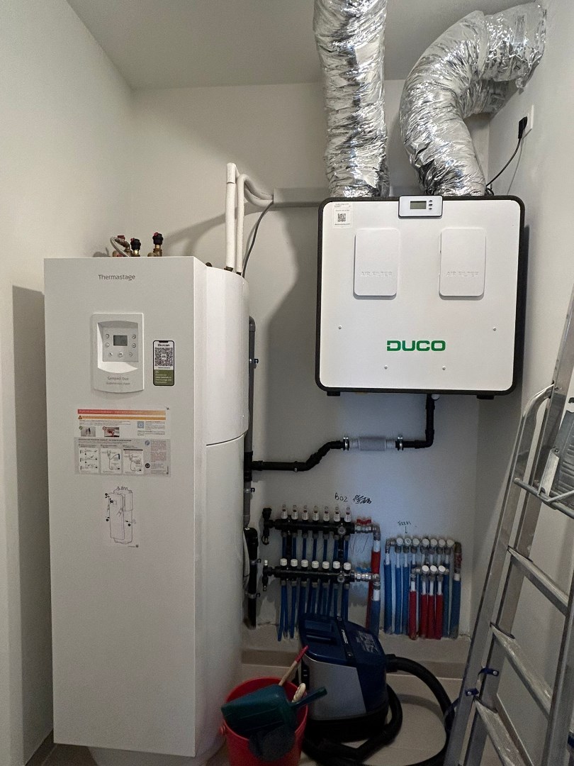Berging met alle technieken: ventilatiesysteem D, warmtepomp, aansluiting wasmachine/droogkast.