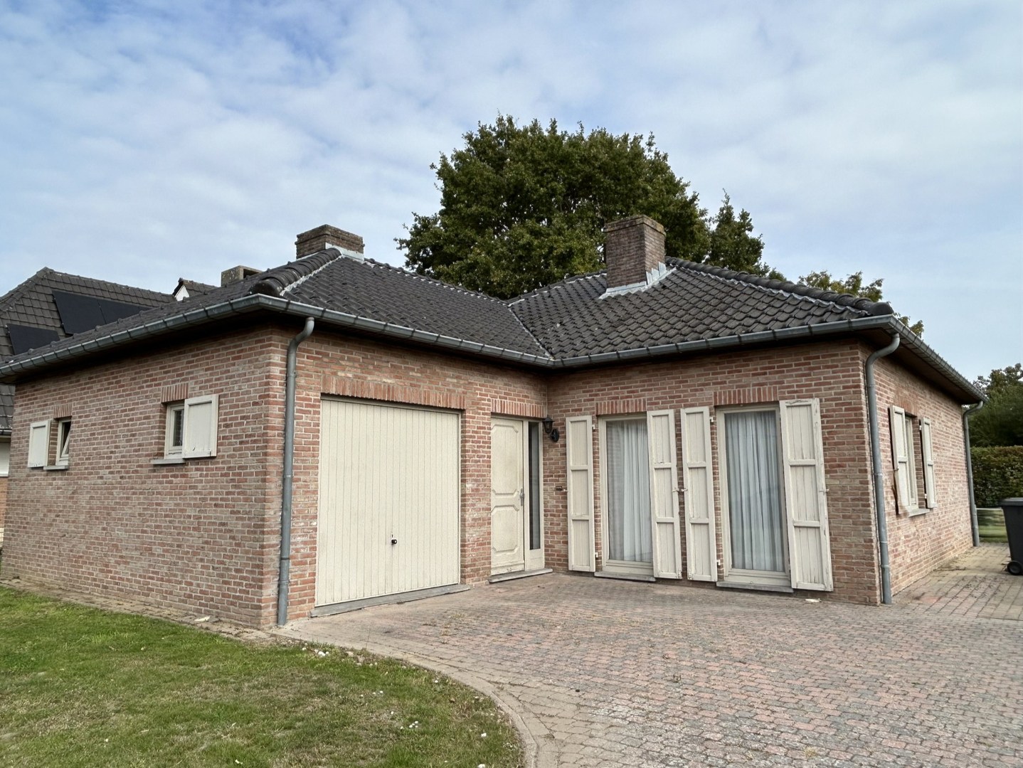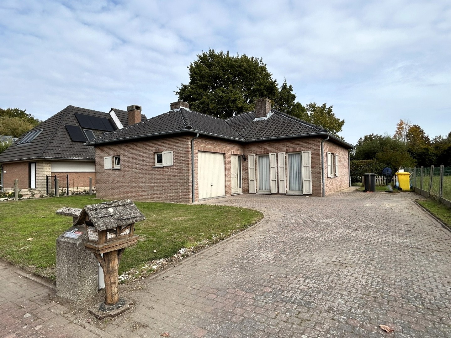Inkomhal, nachthal (luik zolder), garage (houten kantelpoort dewelke kortelings zal vervangen worden naar een automatische sectionaalpoort), watermeter met -verzachter, stookketel, uitgietbak, elektrische installatie, aansluiting wasmachine, luik kruipkelder), living (schuifraam naar tuin), keuken (eikenhouten keuken, ijskast met vriesvak, elektrische kookplaat, dampkap, spoelbak), slaapkamer 1, slaapkamer 2, slaapkamer 3, badkamer (inloopdouche, lavabo in meubel), toilet (wc en lavabo).