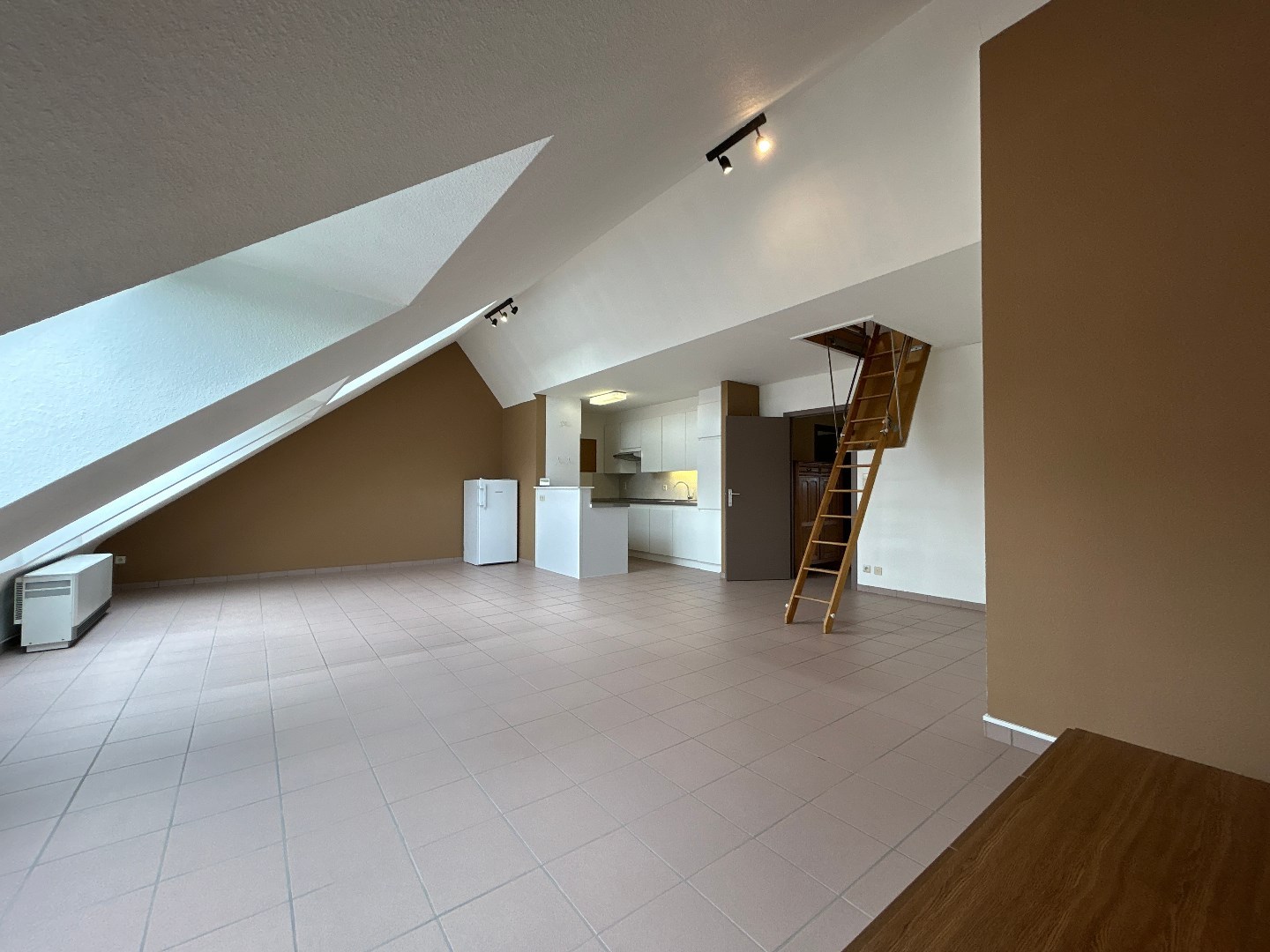 Ruim en lichtrijk dakappartement (136m²) met autostaanplaats in de dorpskern van Wespelaar. Het appartement, gelegen op de tweede verdieping beschikt naast de ruime leefruimte met open keuken over een inkomhal met toilet, twee slaapkamers en een badkamer. Een uitschuiftrap biedt toegang tot de afgewerkte zolderruimte waar een hobbyruimte mogelijk is. Goede verbindingen met openbaar en privatief vervoer. Topligging nabij station Wespelaar. EPC-score 134 (label B). Geen lift.Huurprijs: € 920 p.m. Prov. gem. kosten: € 60 p.m. Huurcontract: 9 jaar (vroegere 3-6-9). Beschikbaar vanaf 01 mei '26. Plaatsbeschrijving op gemeenschappelijke kosten (50/50).
