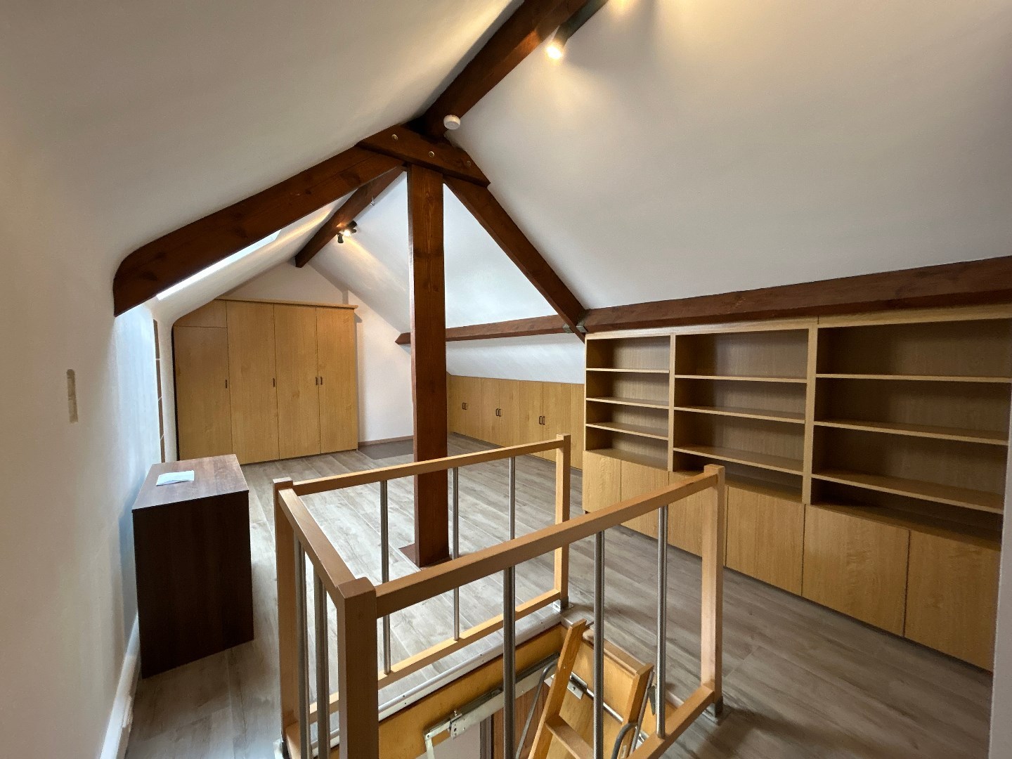 Tweede verdieping links: inkomhal die toegang geeft tot het toilet, twee slaapkamers, de badkamer (ligbad met douche in bad, wastafel, aansluiting wasmachine/droogkast) en de woonkamer (airco) met open keuken (koelkast, kookplaat, oven, dampkap). In de woonkamer is een luik met uitschuiftrap die uitgeeft op de ingerichte (hobby)ruimte erboven.