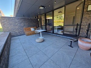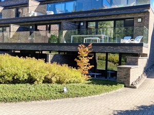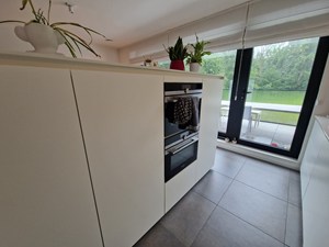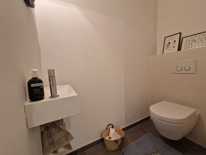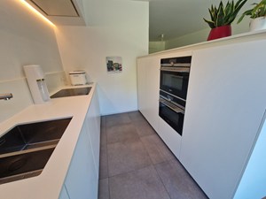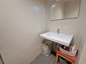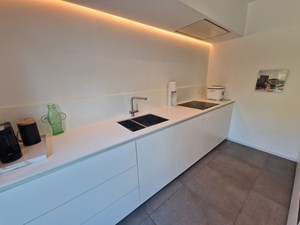 Op straatniveau: inkomhal, bureau, badkamer (douche, dubbele wastafel), toilet, leefruimte, keuken (Inductie kookplaat, vaatwasser, koelkast, 2 combi-ovens (stoom/gewoon en micro/gewoon)), 1 berging met aansluiting wasmachine/droogkast, 1 berging (technische ruimte). Trap naar beneden. Zonneterras (20 m²) met luifel.