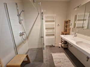 Beneden: nachthal, toilet, badkamer (douche, enkele wastafel) en twee slaapkamers (14 en 11 m²) met aangrenzend een overdekt terras (20 m²).