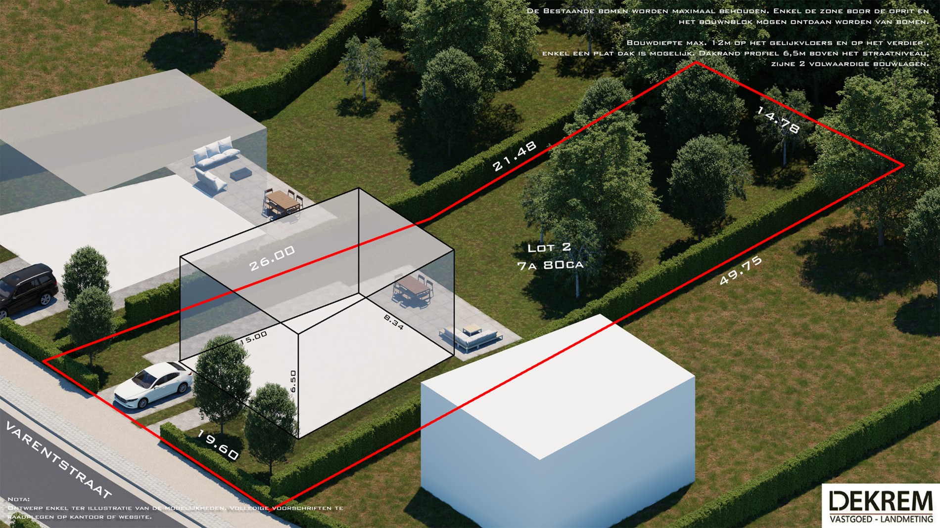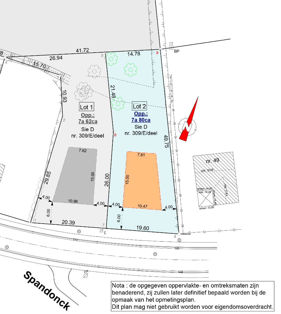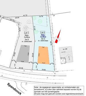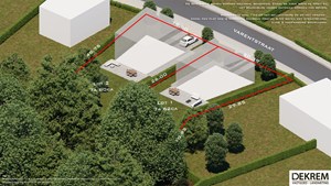 Een definitief opmetingsplan zal nog worden opgemaakt door Dekrem Vastgoed & Landmeten. De kosten van de opmeting zijn ten laste van de koper alsook het aandeel in de kosten voor het opmaken van de verkavelingsakte. Het achterliggende perceel (lot 3) werd uit de verkaveling gesloten. De opmetingskosten hiervan zijn ten laste van de koper.