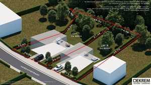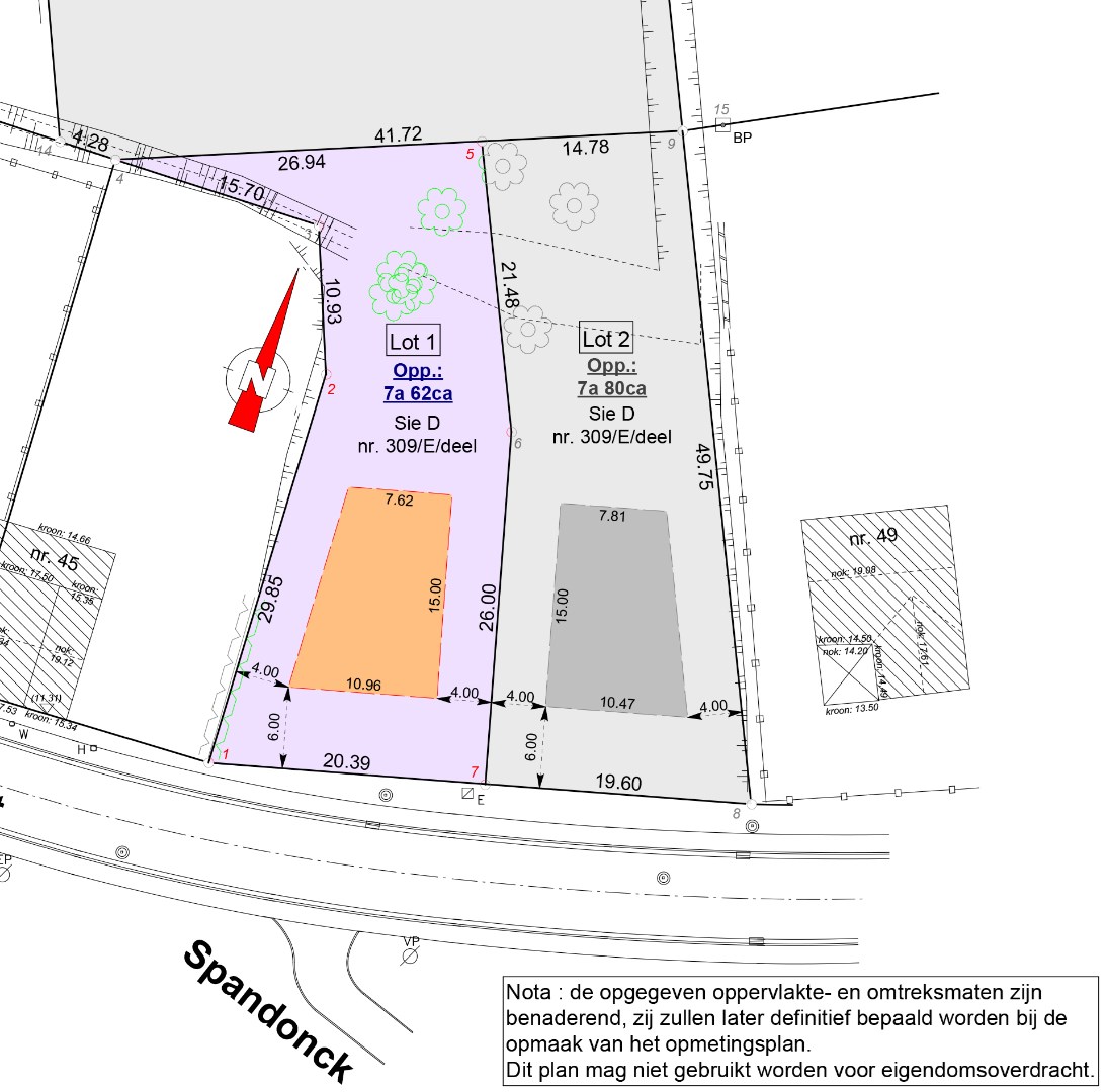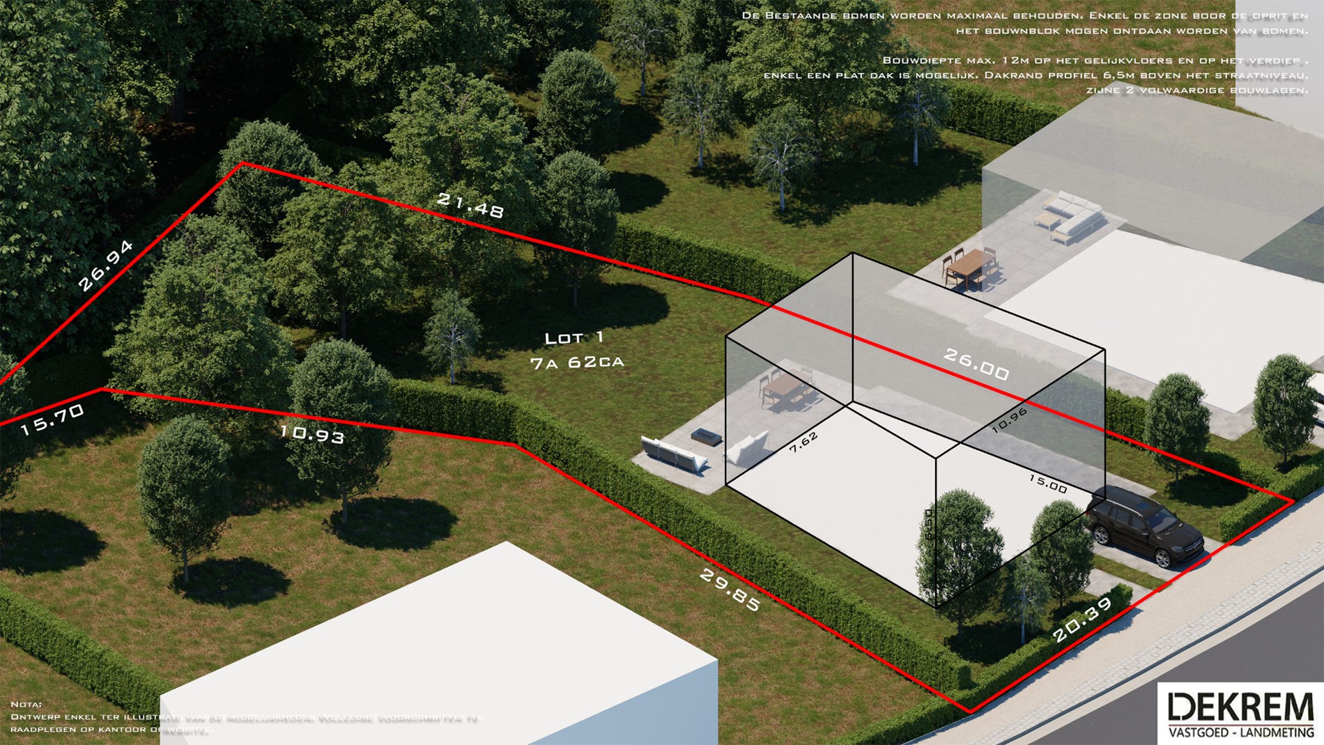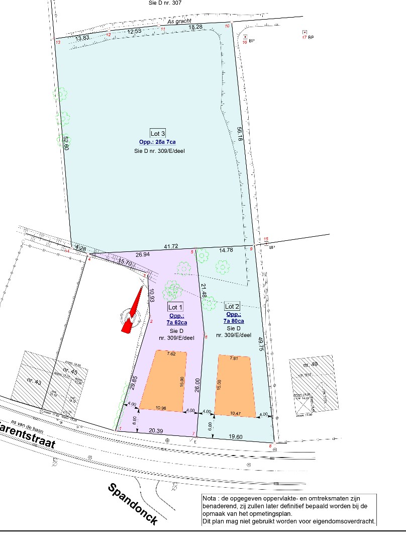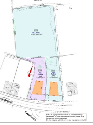 Een definitief opmetingsplan zal nog worden opgemaakt door Dekrem Vastgoed & Landmeten. De kosten van de opmeting zijn ten laste van de koper alsook het aandeel in de kosten voor het opmaken van de verkavelingsakte. Het achterliggende perceel (lot 3) werd uit de verkaveling gesloten. De opmetingskosten hiervan zijn ten laste van de koper.