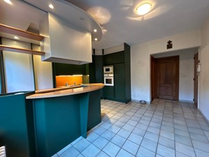 - Ingerichte keuken met toestellen (dampkap, vaatwasmachine, spoelbak, microgolfoven, oven, koelkast) en trap naar kelder.
