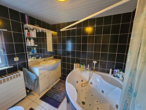 Overloop, slaapkamer 1, slaapkamer 2, slaapkamer 3, badkamer (bubbelbad, lavabo op meubel, toilet, luik zolder).