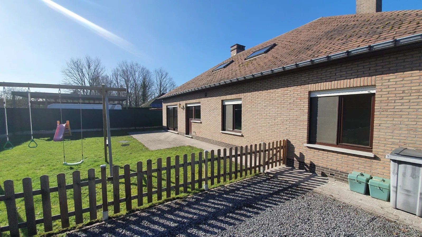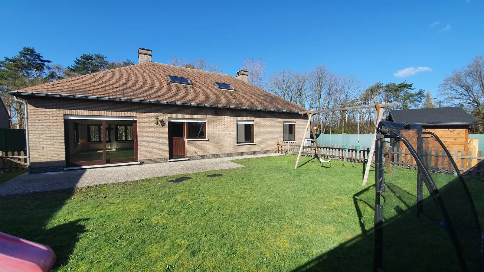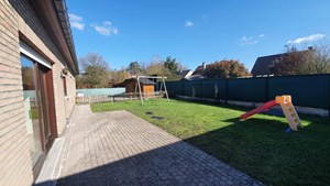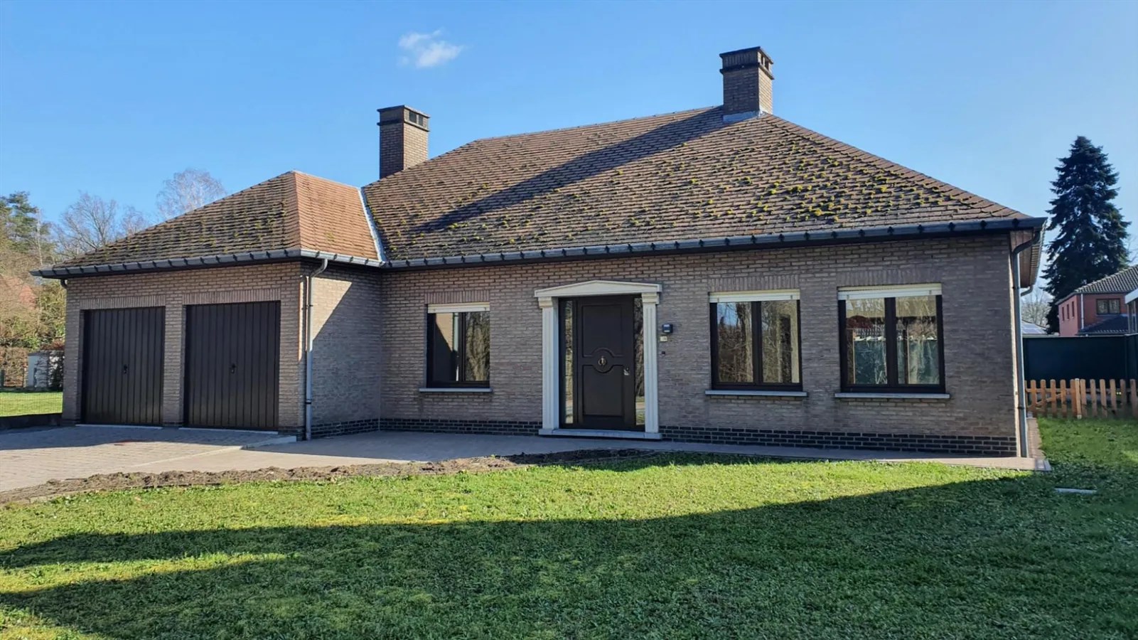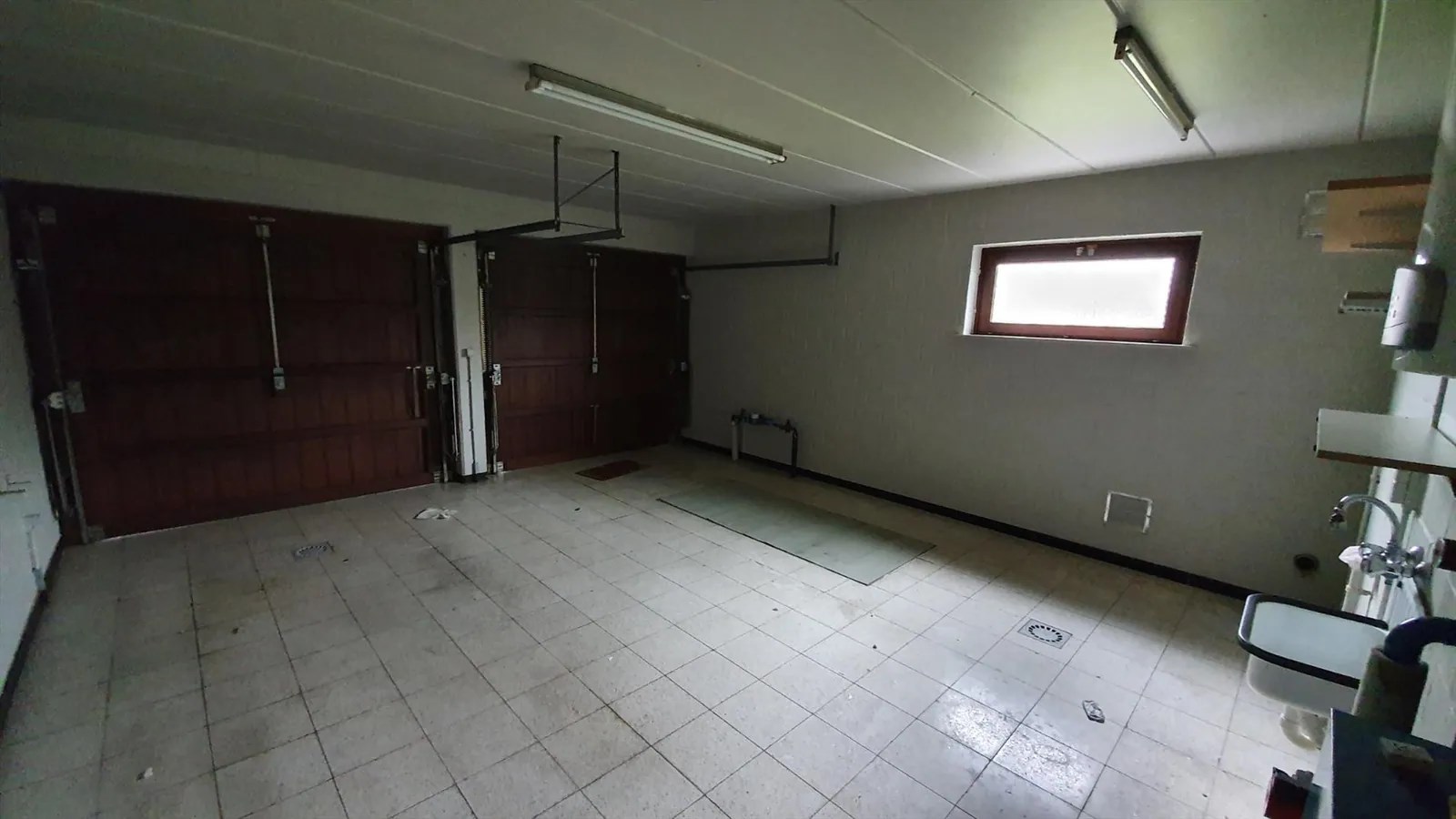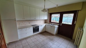 Inkomhal, living (schuifraam naar terras), keuken (buitendeur, heteluchtoven, microgolfoven, inductiekookplaat, dampkap, vaatwasmachine, roestvrije spoelbak met afdruipvlak - foto op website van voor renovatie), nachthal, toilet, slaapkamer 1, slaapkamer 2, slaapkamer 3, badkamer (inloopdouche, wc, 2 lavabo's in meubel, aanbouwkasten - foto op website van voor renovatie), dubbele garage (2 houten kantelpoorten, regenwaterpomp, watermeter, condensatiegaswandketel met boiler, uitgietbak, installatie elektriciteit, toegang kruipkelder, trapluik naar zolder, aansluitingen wasmachine en droogkast).