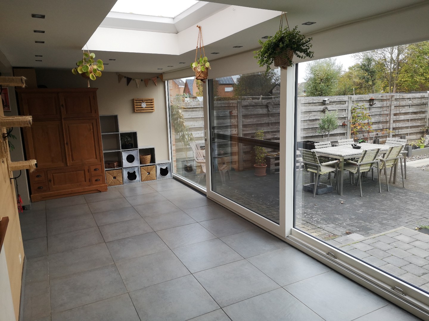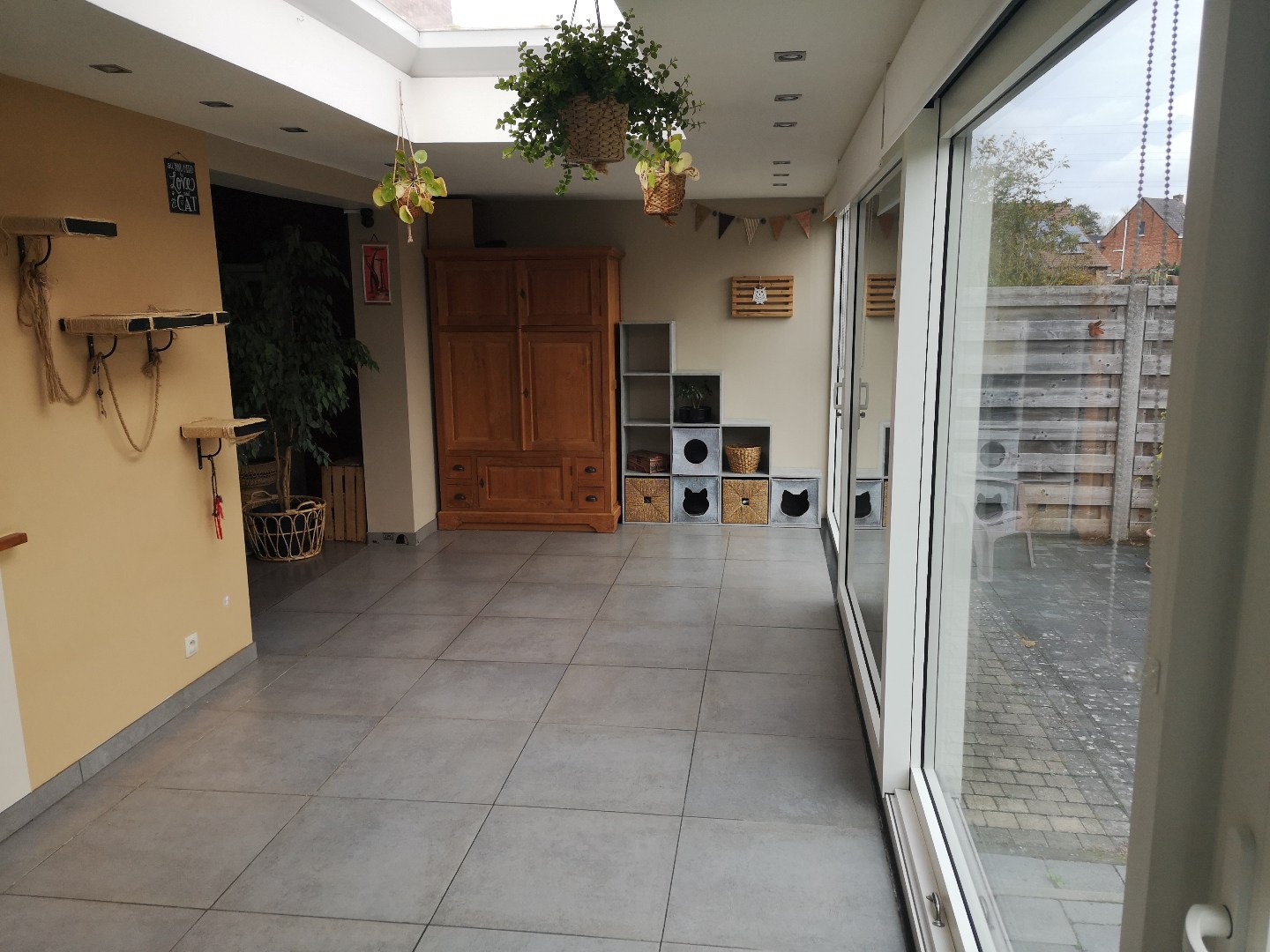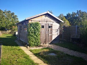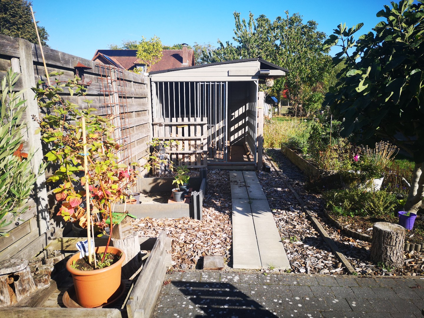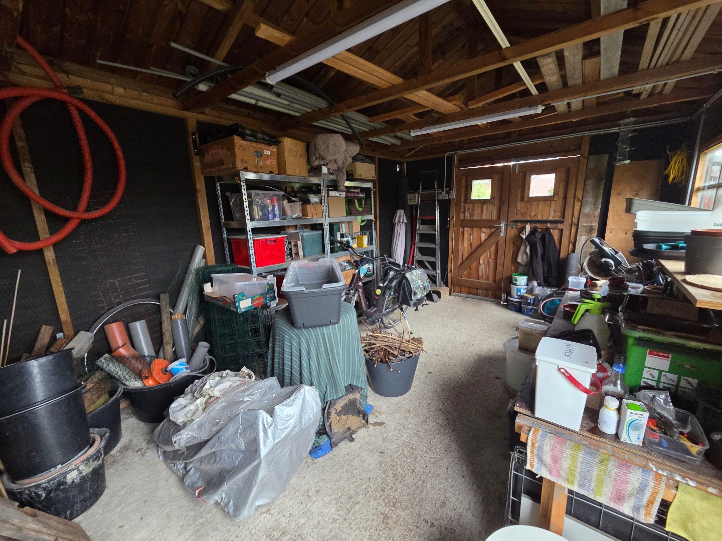 Buiten: terrasverhardingen, tuinhuis, groot hondenhok, houtopslag.