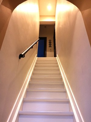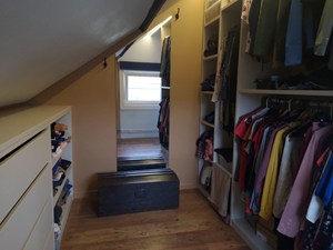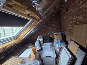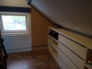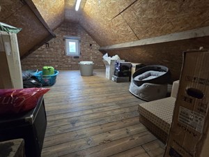 V1: Nachthal met luik naar zolder (inschuiftrap). 2 slaapkamers en één kamer, in te richten als badkamer (aansluitingen aanwezig) of extra kamer/bureau.