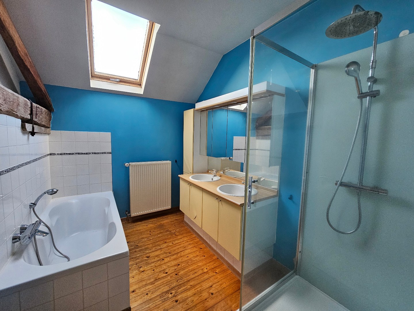- Muren : geschilderde gipsplaten, betegeld.
