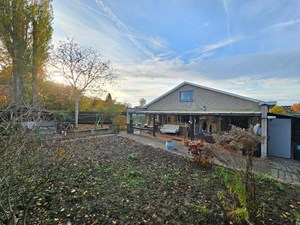 Overdekt terras, houten tuinhuis en gemetst tuinhuis.
