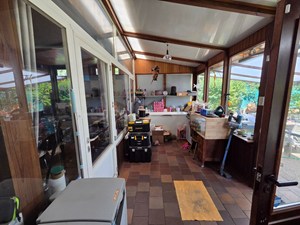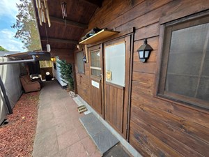 Buiten: aangebouwd: garage en tuinberging, terras, oprit, tuinhuis.